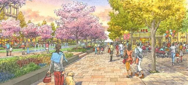在武汉CBD的林立高楼之间,一条自北向南延伸的大道串起住宅区、写字楼群、商业步行街。它参考日本、丹麦、法国的街道设计,草坪、喷泉错落,320米长的绿化带里银杏金桂柿子树繁茂,咖啡亭和长椅散落,像一座公园纵向铺开,三个月后春暖花开的时候,你会看到它的真容。明年春夏季节,这可能是武汉又一个晒太阳读书的文艺小资好去处。