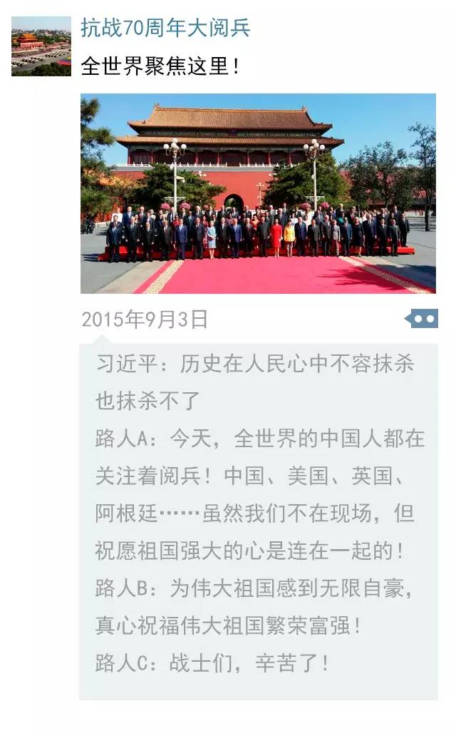 2015是中国纪念人民抗日战争暨世界反法西斯战争胜利70周年,中国于9月3日组织阅兵,多国首脑参加阅兵仪式,那一天,中国备受世界瞩目。