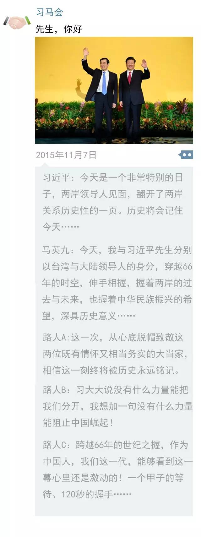 11月7日下午,两岸领导人习近平、马英九在新加坡香格里拉酒店的“世纪之握”,这是跨越了66年的一次会面,我们通过朋友圈也成为这一次会面的见证者。
