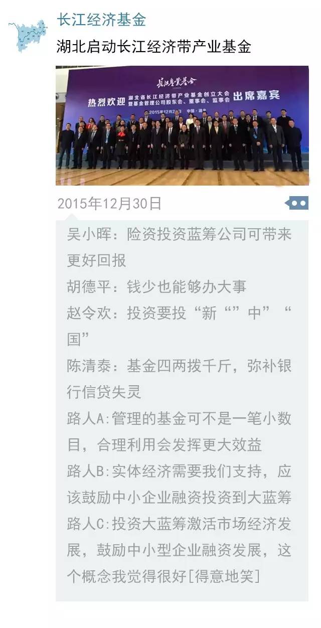 12月30日,朋友圈晒出的这张合影,关乎到湖北经济的发展,湖北省财政出资400亿设立引导基金,发起共2000亿左右的基金群,构成湖北省长江经济带产业基金,最终带动约10000亿元社会投资。会上,各界嘉宾可谓是最有份量的合影。