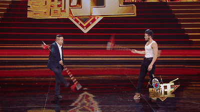 更令人没想到的是,谢孟伟还会演喜剧!表演完后,他主动邀请潘长江上台一起“比划比划”,只见两人拿着花枪技术娴熟、耍得不亦乐乎,迷倒一片女粉丝!不过……潘长江帅不过3秒,不信看节目!