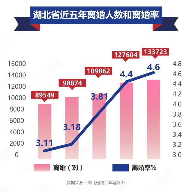 湖北省自1999年离婚率出现下降以后,16年来不断上升,据《湖北省统计年鉴2015》的披露,这一数字从千分之零点六六增长到2014年的千分之四点六,涨了快7倍。同时,离婚夫妻数也每年以将近万人左右的速度增长,“结离比”达到5:1。从人数上看,2014年平均每天有366对夫妻离婚。