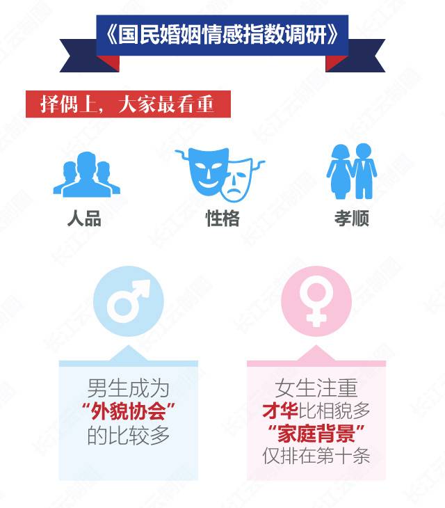 而在某婚恋网站发布的《国民婚姻情感指数调研》报告中显示,择偶上,大家最看重人品、性格和孝顺。男生成为“外貌协会”的比较多;女生注重才华比相貌多,“家庭背景”仅排在第十条。