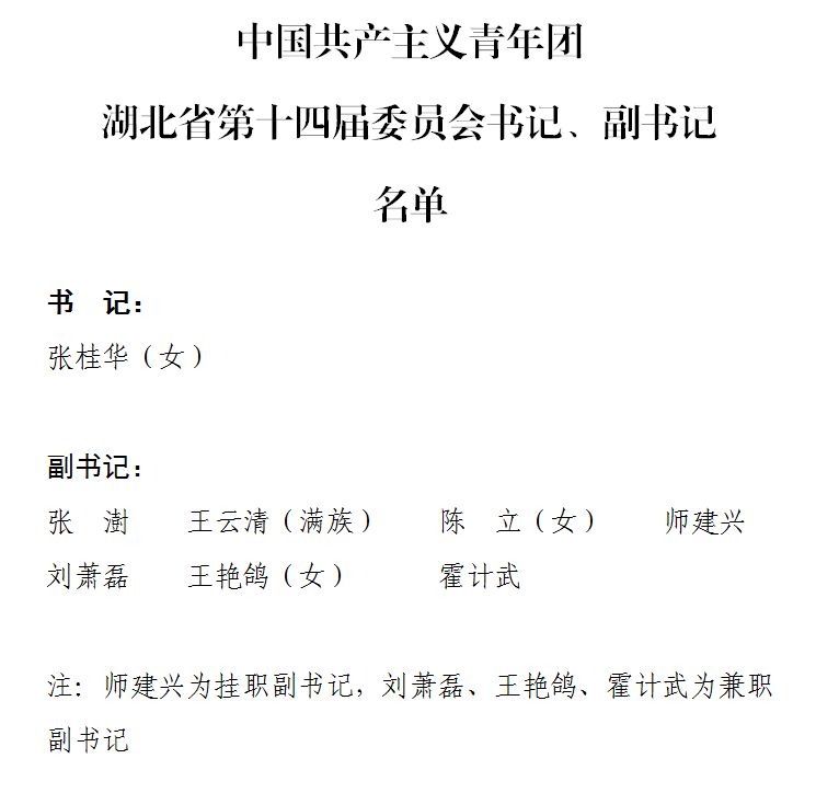 2月2日下午,共青团湖北省第十四届委员会举行第一次全体会议,选举产生共青团湖北省第十四届委员会书记、副书记、常务委员会委员。