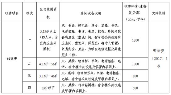中等职业学校住宿费将依据学生使用面积,分为四个不同档次。住宿费从500元到1200元不等。