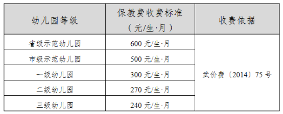 省级示范幼儿园保教费每月为600元/生,市级示范幼儿园为500元/生,一级幼儿园为300元/生,二级幼儿园为270元/生,三级幼儿园为240元/生。