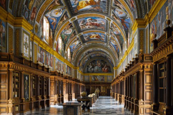 被称为拥有世界最美顶棚的西班牙埃斯科里亚尔图书馆,位于西班牙圣洛伦索,由西班牙国王腓力二世修建,以其拱形顶棚,和挂墙式书架而闻名。