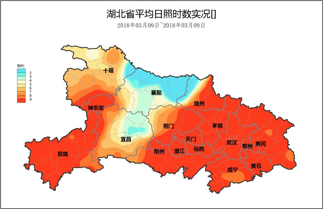 除了襄阳、宜昌、随州和十堰部分地区日照较为短暂外,