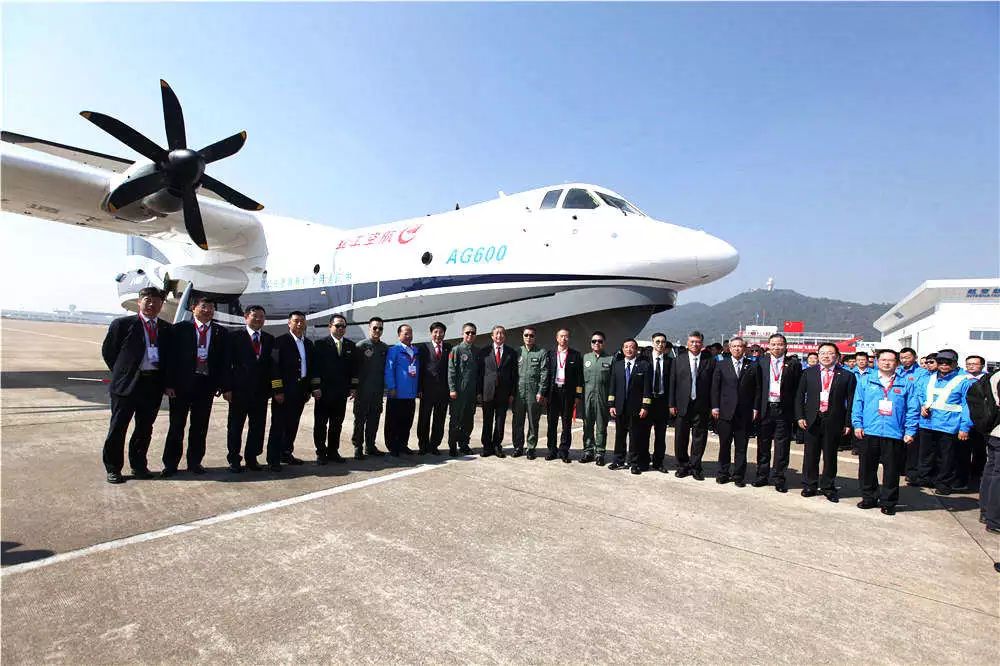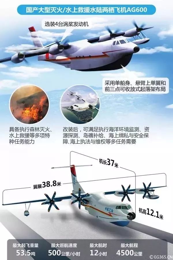 AG600是我国为满足森林灭火和水上救援的迫切需要,首次研制的大型特种用途民用飞机,是国家应急救援体系建设急需的重大航空装备。该机采用悬臂上单翼、前三点可收放式起落架、单船身水陆两栖飞机布局形式,选装4台国产涡桨发动机,最大起飞重量53.5吨,具有载重量大、航程远、续航时间长的特点。