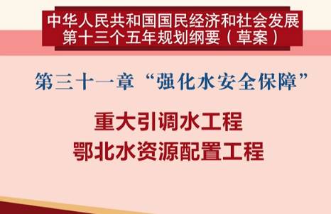 《十三五规划纲要(草案)》第三十一章“强化水安全保障”把鄂北水资源配置工程列入重大引调水工程。至此,这个在“十二五”期间由湖北提出并推动的民心工程,上升到了国家层面。