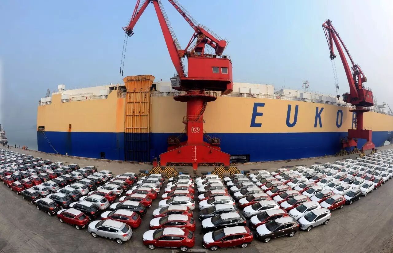 ↑2016年1月9日,大批国产汽车在连云港港64泊位码头等待装船运往国外。 新华社发 王春 摄