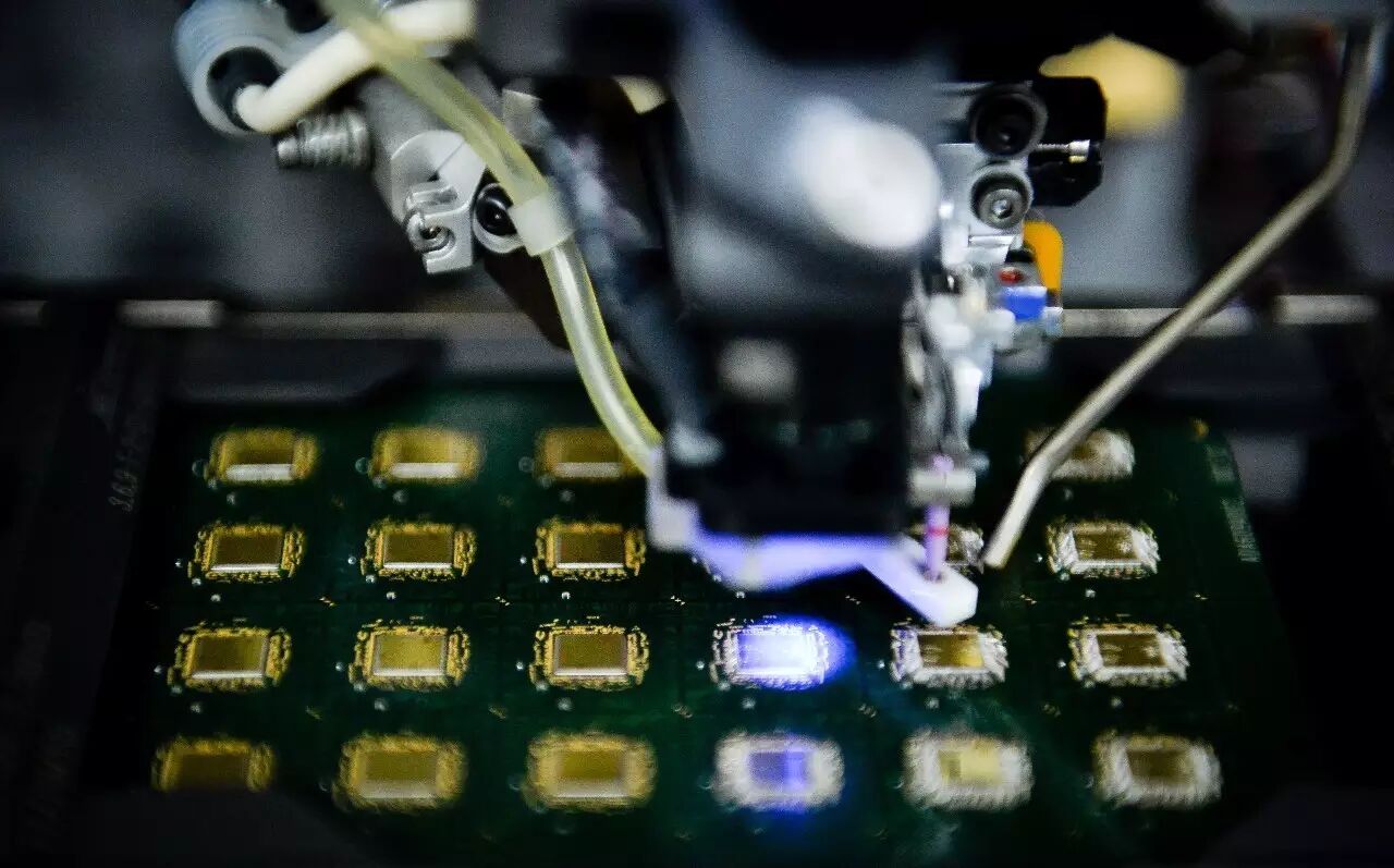 ↑2016年2月27日,江苏江阴长电科技组装车间球焊区域,球焊机台在给芯片焊线。 新华社记者 李响 摄