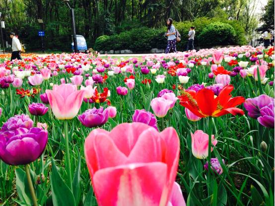这些郁金香布置在武汉植物园景观温室周围、中心草坪、林间小道以及湖岸带等展区,与园内景色融为一体,高大的乔木、流动的湖水、树荫、绿径、草坪与花团锦簇的郁金香交相辉映,营造更加生态更加自然的观感。