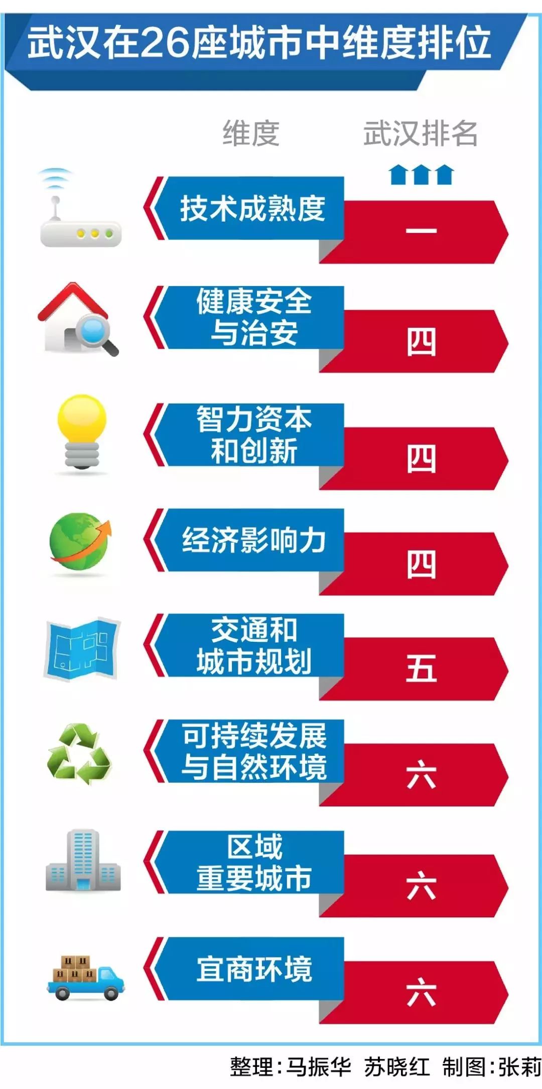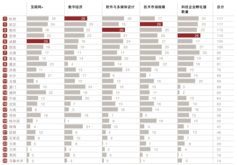 在这26座城市中,武汉位列第二,延续了2017年的排列次序。在10个维度的排名中,武汉有9个维度的排名位列前六,其中“技术成熟度”维度排名第一。在57个变量的排名中,在中等职业教育规模、技术市场规模、医疗设施上,武汉排26城市中的第一位。