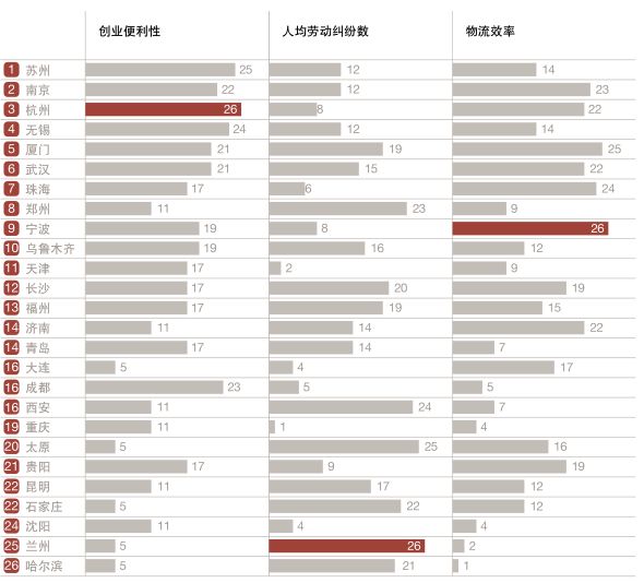 除北上广深四城以外,余下26 座城市的综合数据梳理结果:杭州位居第一,随后是武汉、南京、成都、厦门、西安、天津;接下来是长沙、苏州、郑州、珠海、青岛、济南、昆明、重庆、宁波,其中长沙上升了两位,青岛排在了济南的前面,但重庆却下降了三个位次。后十位序的城市依次是无锡、福州、贵阳、大连、太原、沈阳、乌鲁木齐、石家庄、哈尔滨、兰州。