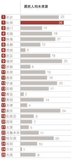 数据梳理结果,长沙与杭州并列第一。长沙在维度中居首得益于在“碳排放”变量上排第一,在“污水集中处理率和生活垃圾无害化处理率”变量上排第二,在“居民人均水资源”位列第四,使得累计积分最高。变量统计是枯燥的,并且有些抽象,但这一结果与现实生活却十分贴切。