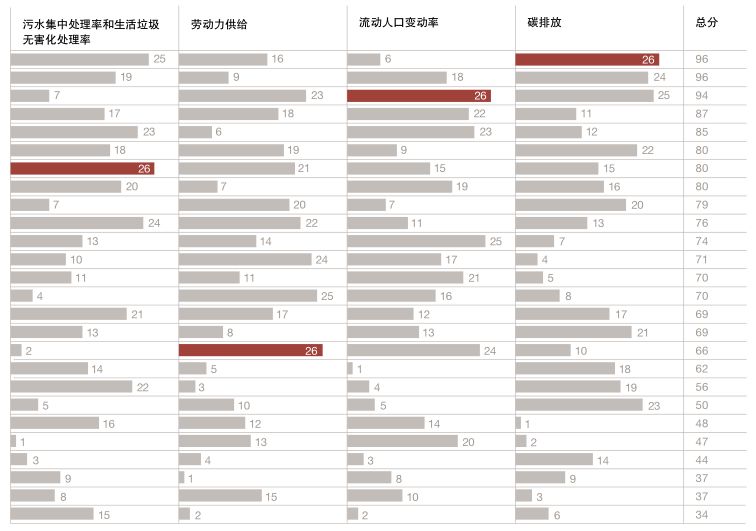 其中,“城市流动人口状况”观察的是城市5年间流动人口的变动。在这个维度中,珠海和南京在多数变量中排位靠前,因此总排名连续两年位列前茅。排名紧随其后的是杭州、厦门、武汉和西安。