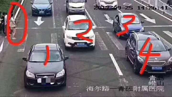青岛一司机收到违章处罚,处罚原因是行车时不避让行人。如图所示,当时机动车是绿灯,人行道是红灯,图中1、2、3、4车辆刚起步,图中左侧红圈内女士一脚迈进了人行道。结果是,图中一二三四车辆全部违章,罚款50元扣3分,理由是没避让行人。