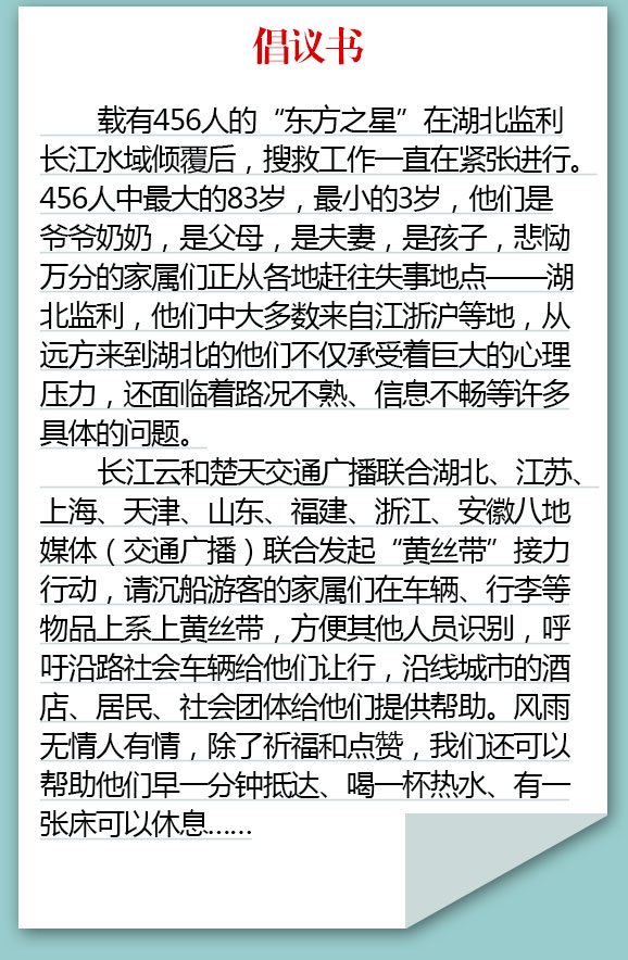 长江云与楚天交通广播联合湖北、江苏、上 海、天津、山东、福建、浙江、安徽八地媒体(交通广播)发起“黄丝带”接力行动,请沉船游客的家属们在车辆、行李等物品上系上黄丝带,方便其他人员识别, 我们会呼吁沿路的社会车辆给他们让行,沿线城市的酒店、居民、社会团体给他们提供帮助。风雨无情人有情,除了祈福和点赞,我们还可以帮助他们早一分钟抵达、喝一杯热水、有一张床可以休息……