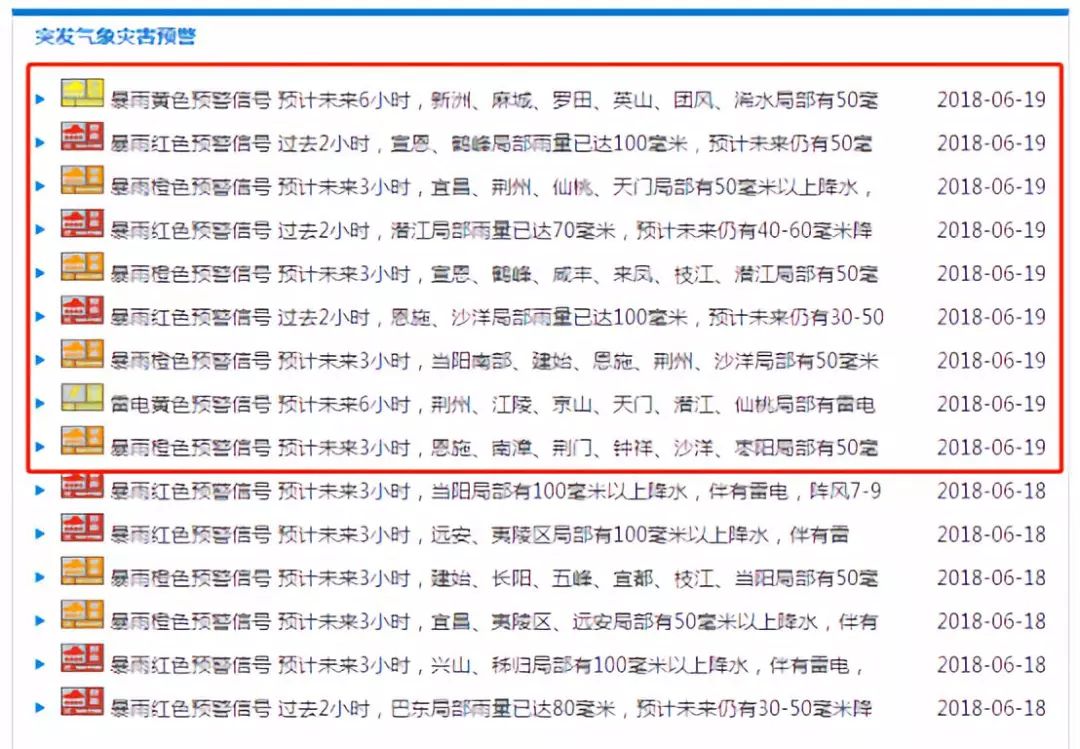 6月19日,湖北省水利厅发布雨情,6月18日8:00-6月19日10:00,全省共有87个县市、1370个站点发生降雨,其中,最大降雨站点在宜昌当阳市巩河水库,降雨量为238毫米。十堰市郧西县、恩施州巴东县、潜江市等地因为暴雨引发地质灾害,造成部分农作物受淹和城区内涝。