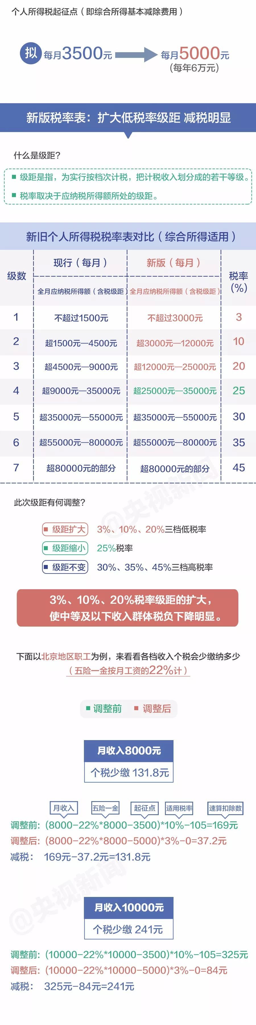 “起征点”上调,税率结构优化调整,一系列改革动作后,你每月会少缴纳多少钱?一张图看懂↓