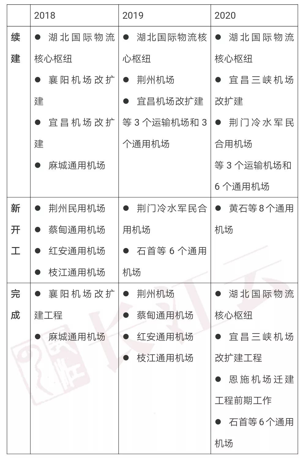 全面开工并基本建成湖北国际物流核心枢纽项目,完成新建荆州机场和改扩建襄阳、宜昌机场,力争到2020年建成运输机场达到8个。启动实施荆门冷水机场军民合用工程,加快推进恩施机场迁建等前期工作,研究推进神农架机场与周边通用机场互动发展。建成麻城、蔡甸等一批通用机场,力争3年内建成和在建通用机场达到23个(其中建成通用机场达到15个),努力实现所有市(州)拥有通用机场或兼顾通用航空服务的运输机场。