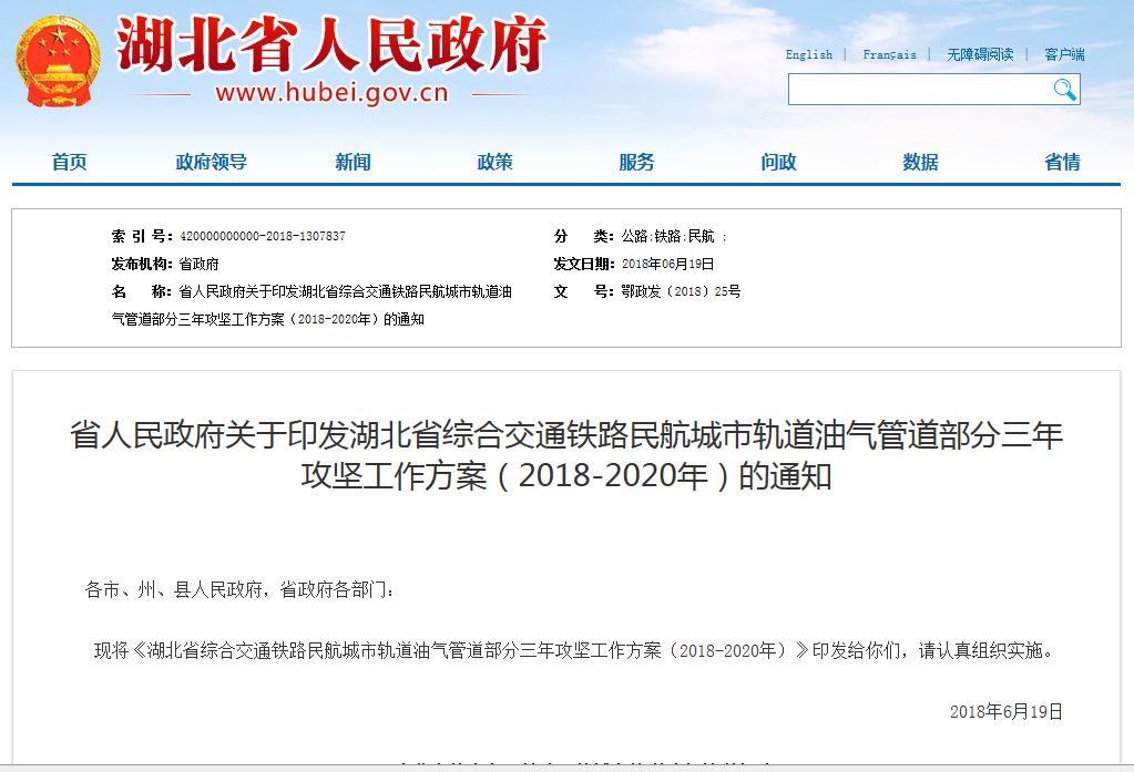 湖北省政府官网发布了《湖北省综合交通铁路民航城市轨道油气管道部分三年攻坚工作方案(2018-2020年)》。