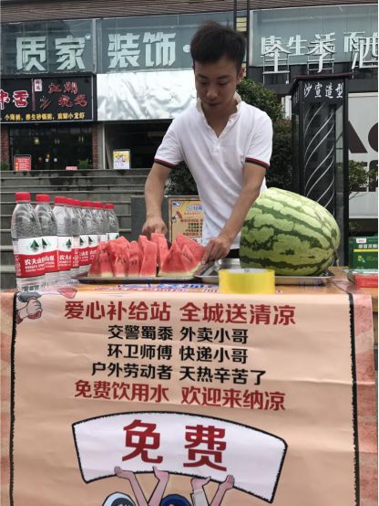 中建三局三公司的几位职工,在看到“爱心补给站 全城送清凉”活动后,大家自掏腰包,以个人名义组织了这次公益活动。在光谷软件园路的轨道交通路口,他们设置了这样一个爱心补给站,还计划购置一个二手冰柜,能为执勤的民警以及附近的户外工作者定期送来一些冰水。