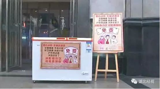 在武汉市城管委的支持下,我们联手汉口二厂汽水,苏宁小店,汪玉霞绿豆糕,携程旅游等百余家爱心企业、商户、单位、个人,在武汉城区临街处设置了多处爱心冰柜,为户外劳动者提供免费冷饮。