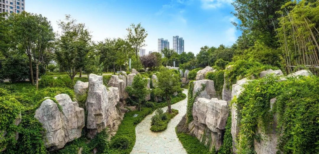 溪流的蜿蜒曲折、台地的错落有致、草坪的葱郁疏朗,