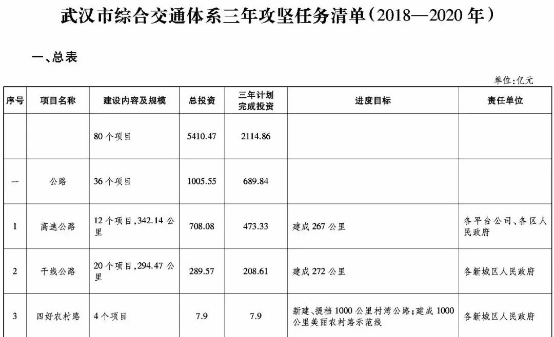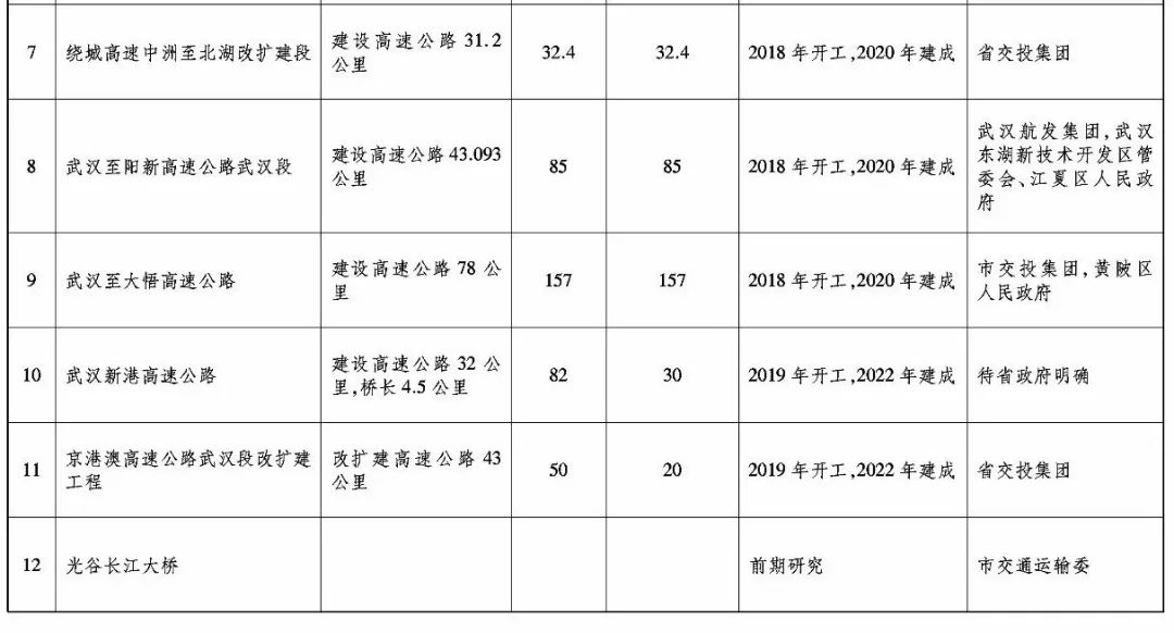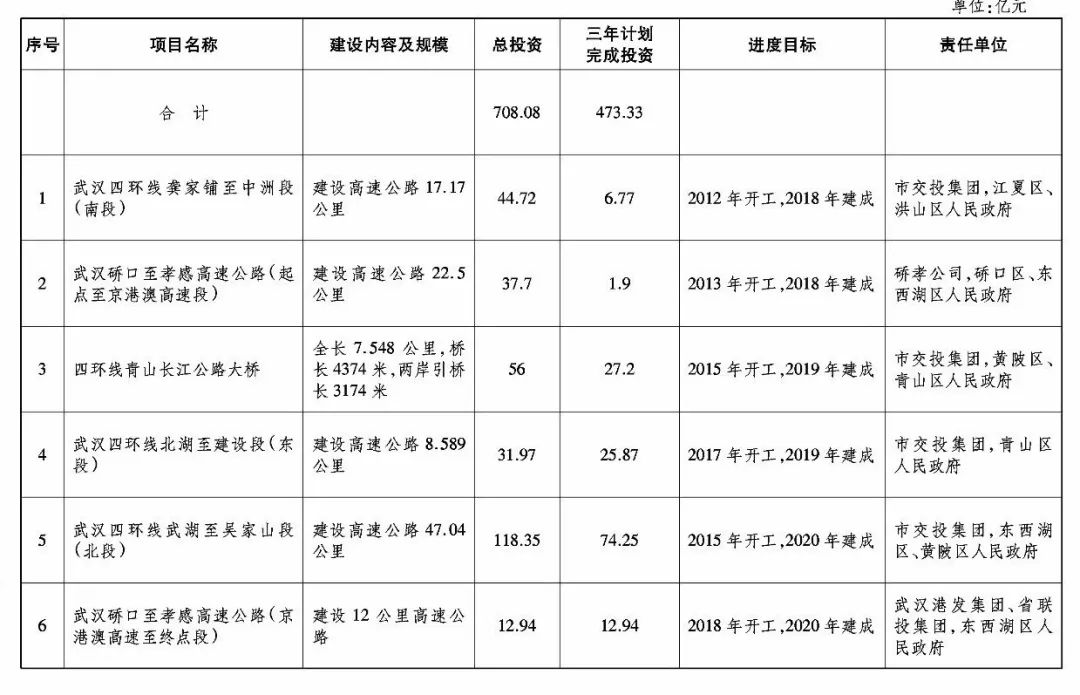 重点建设项目:四环线高速公路、绕城高速中洲至北湖改扩建工程、武汉至阳新高速公路武汉-鄂州段、武汉至大悟高速公路、新港高速公路(含双柳长江大桥)、武汉硚口至孝感高速公路、京港澳高速武汉段改扩建工程、光谷长江大桥。