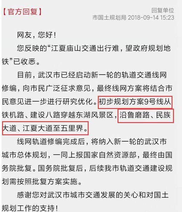 9号线初步规划方案为:从铁机路、建设八路穿越东湖风景区,沿鲁磨路、民族大道、江夏大道,到五里界