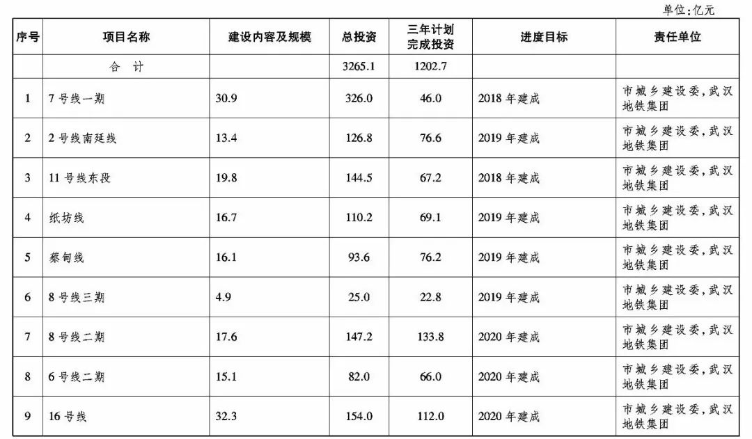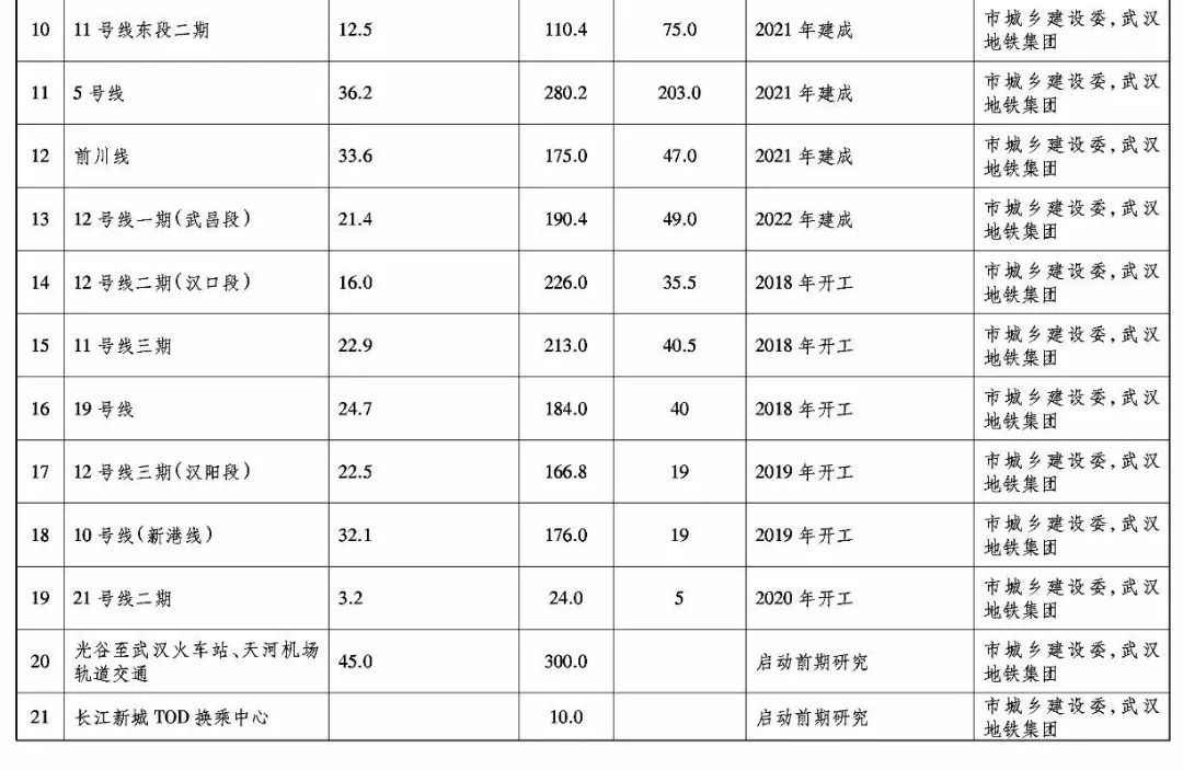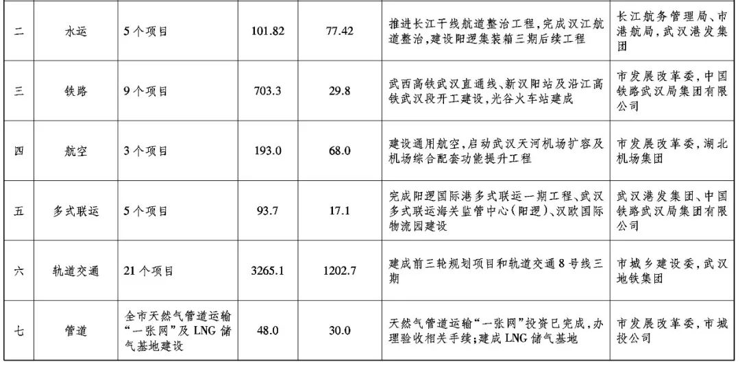 重点建设项目:地铁7号线一期、2号线南延线、11号线东段、纸坊线、蔡甸线、8号线二期、8号线三期、6号线二期、16号线、11号线东段二期、5号线、前川线、12号线一期、11号线三期、19号线、21号线二期、10号线(新港线),光谷-武汉火车站及天河机场磁浮轨道交通工程,长江新城TOD换乘中心。