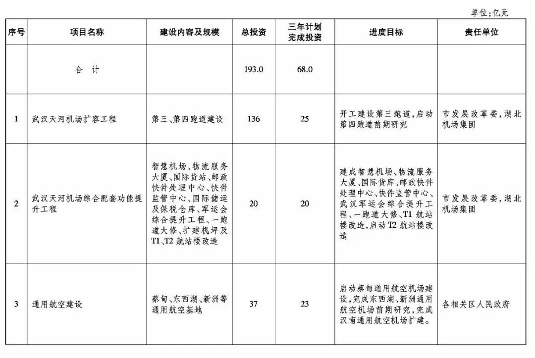 重点建设项目:天河机场扩容工程、天河机场综合配套功能提升工程、通用航空建设。