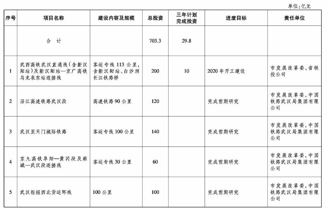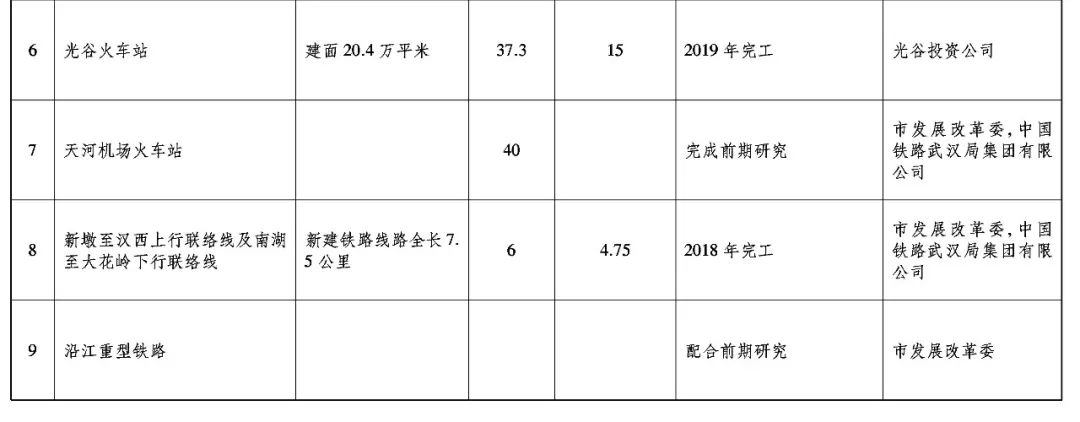 重点建设项目:武西高铁武汉直通线(含新汉阳站)及新汉阳站-京广高铁乌龙泉东站连接线、沿江高铁武汉段、沿江重型铁路、武汉-天门城铁、京九高铁阜阳-黄冈段及麻城-武汉段连接线、武汉枢纽西北货运环线、光谷火车站、天河机场火车站、新墩-汉西上行联络线及南湖-大花岭下行联络线。