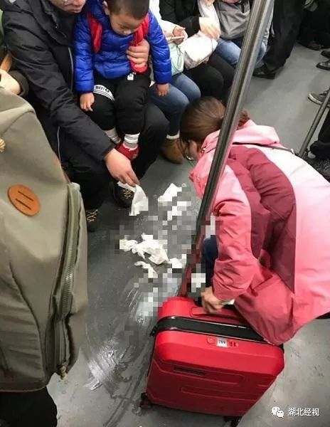 今年1月,上海地铁2号线,一位孩子估计是晕地铁,突然吐了。这位妈妈首先是用手接呕吐物,但是孩子吐了很多。爸爸妈妈却非常负责,亲手用纸巾将孩子的呕吐物擦干净,然后从包里拿出塑料袋,将纸巾装入袋子中。