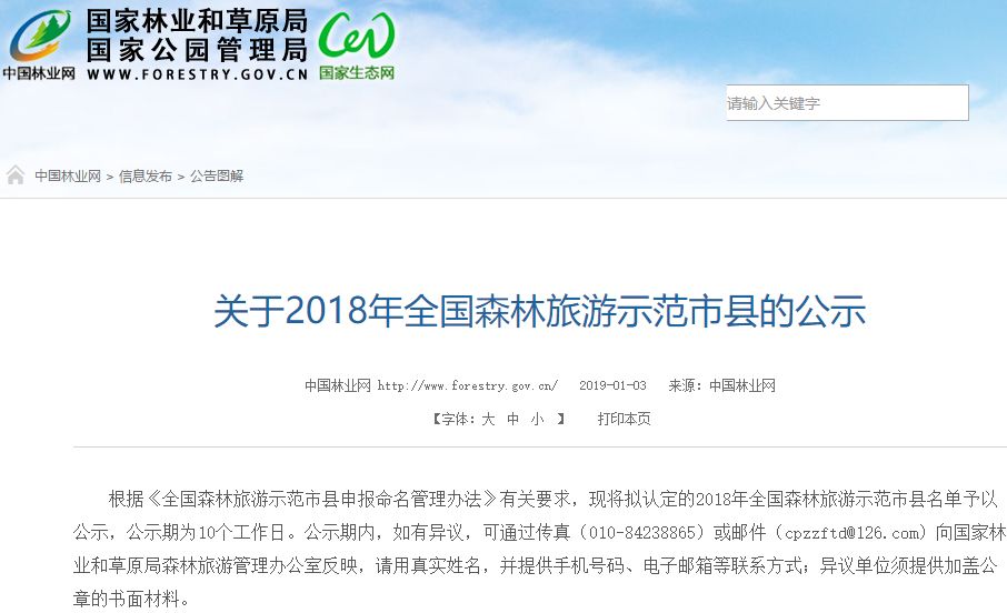 1月3日,中国林业网发布《关于2018年全国森林旅游示范市县的公示》,公开了拟认定的2018年全国森林旅游示范市县名单!