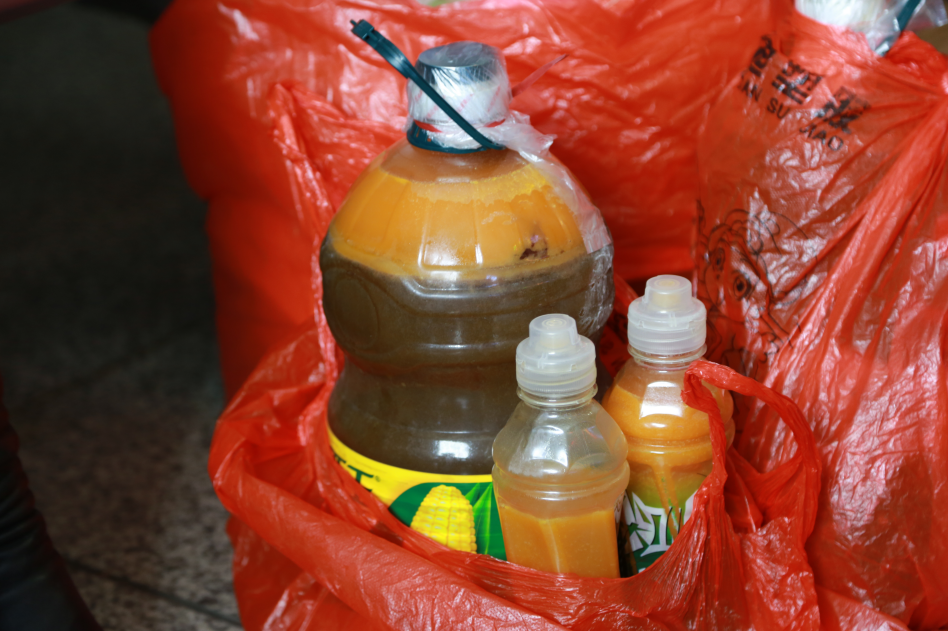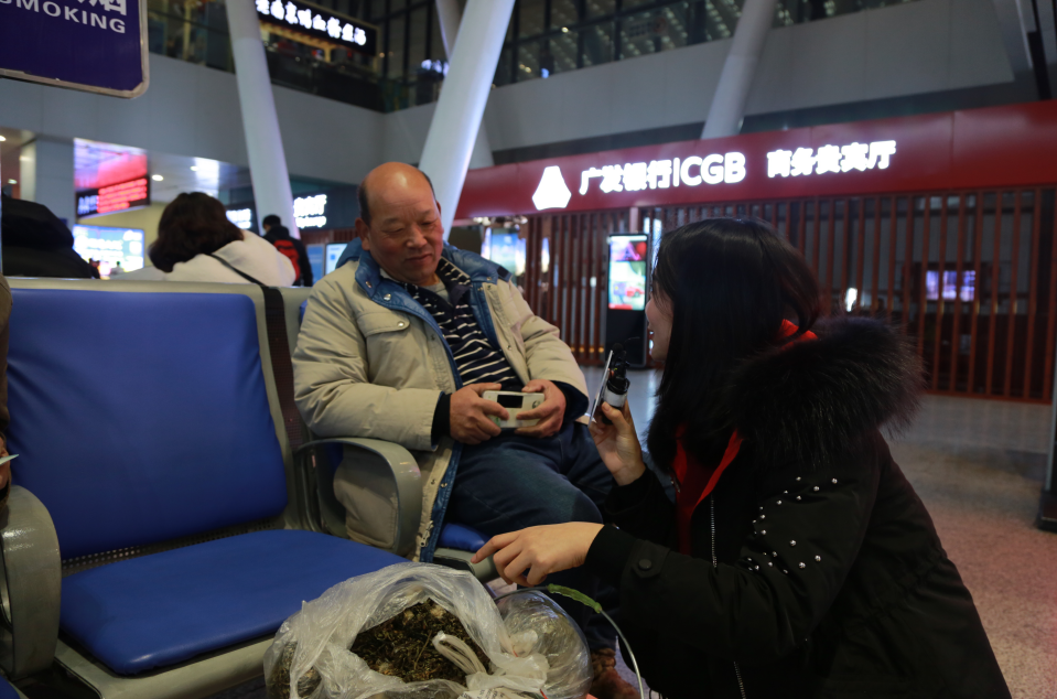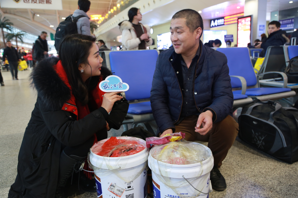 王大哥,河北人,来湖北已经6年了,在黄石大冶的一个铁矿上班。“桶里装的是香肠、腊鱼,都我自己做的!老家的冬天,这些腊味晒不成,在湖北晒好直接带回去。”王师傅说,别看这满满两大桶的香肠、腊鱼,回到家一下子就会被分完了。“自己灌的香肠,吃起来更放心些,也是给家人带回去的一点心意。”