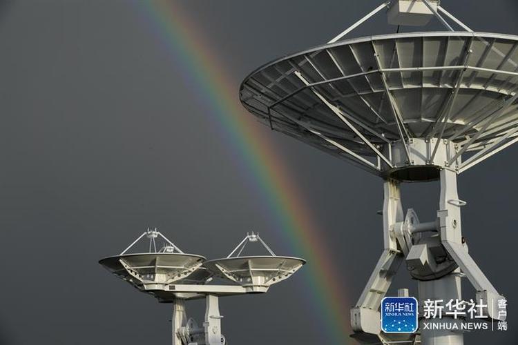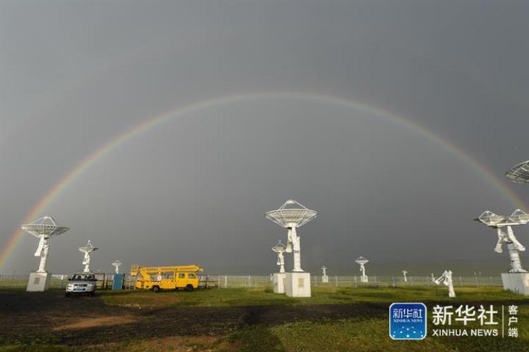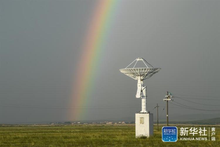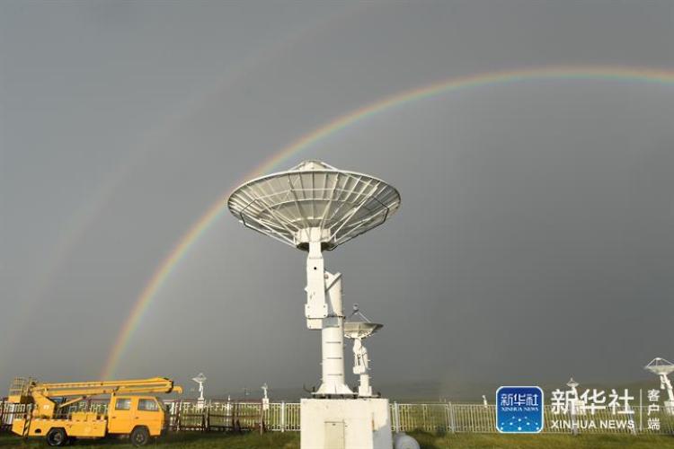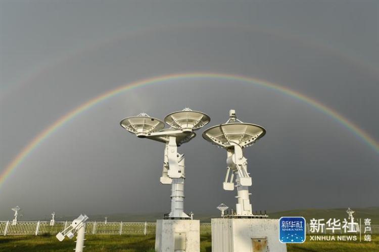7月27日,位于内蒙古自治区正镶白旗的国家天文台明安图观测站附近迎来雨后彩虹,科技感十足的抛物面天线在草原上“邂逅”彩虹,形成一道奇景。