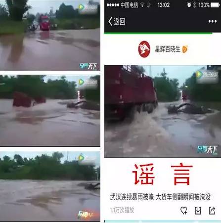 辟谣:武汉市交管局表示,经过仔细认真地观看网上传播的这段视频,确认这起事故发生的地点和视频中的车辆,都不是在武汉,交管部门更没有接到类似事故的报警。2016年7月6日,北京电视台新闻频道《今晚7点》栏目的“都市晚高峰”,两名主持人在介绍武汉暴雨引发的城市内涝时,首先就引用了这段卡车在洪水中侧翻的视频,并将该段视频与武汉其他渍水路段的视频编辑在一起播放;2013年8月27日,河北卫视《看今朝》栏目就曾将这段大货车涉水侧翻的视频,作为东北大雨的画面进行播放;2013年8月23日,辽宁卫视播出的《第一时间》栏目,该栏目以这段视频为例,对连降大雨的条件下如何安全行车进行提醒。
