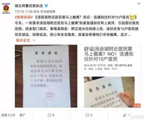 辟谣:经多部门核实,事情真相是:野芷湖水位持续上涨,该社区有10户居民就住在湖边,地势低洼,担心有安全隐患,居委会希望他们尽快撤离,这才发布了通知。湖北网警及时联合新浪微博#微博辟谣#发文澄清了事实真相。