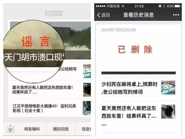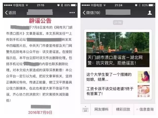 事件:7月8日22时28分,湖北天门一微信公众号发布题为《网传天门胡市溃口现场拍摄图》的文章,文中附有四幅洪水凶猛急流的照片,谣称“天门胡市溃口”。微文一经发布即引发当地网民热议。
