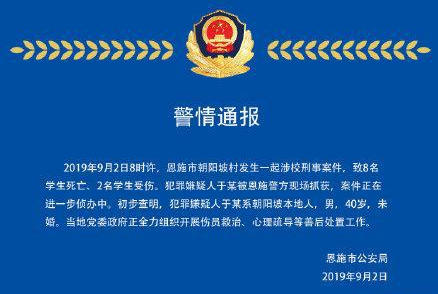 2019年9月2日8时许,恩施市朝阳坡村发生一起涉校刑事案件,致8名学生死亡、2名学生受伤。犯罪嫌疑人于某被恩施警方现场抓获,案件正在进一步侦办中。初步查明,犯罪嫌疑人于某系朝阳坡本地人,男,40岁,未婚。当地党委政府正全力组织开展伤员救治、心理疏导等善后处置工作。