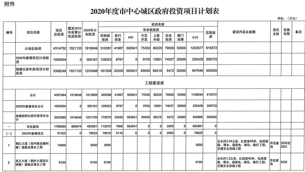近日,荆州市政府下达《2020年度市中心城区政府投资项目计划的通知》 。《通知》中明确了2020年市中心城区政府投资项目283个,计划投资181.87亿元,涉及城市道路及配套设施、生态修复及环境治理、旧城改造、园林绿化、城市管理、文化保护、规划研究等八个重点领域。
