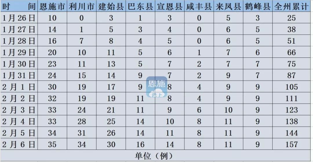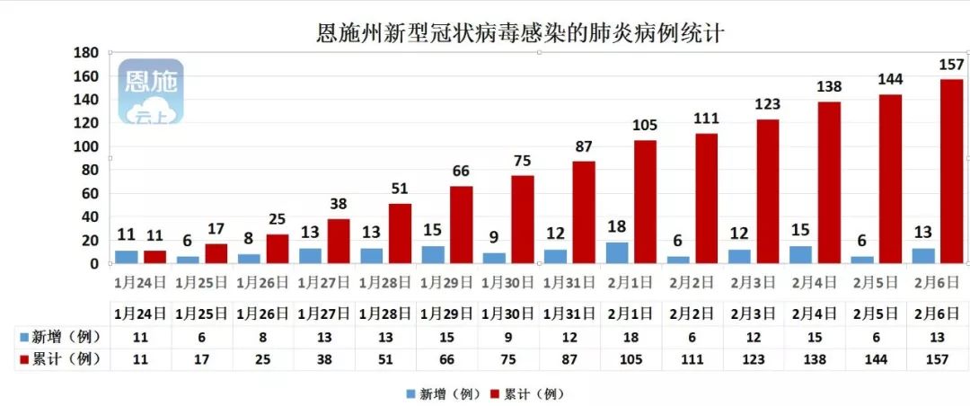2020年2月6日0时-24时,恩施州新增新型冠状病毒感染的肺炎病例13例(恩施市1例、利川市3例、建始县4例、巴东县2例、宣恩县3例)。截至2020年2月6日24时,恩施州累计报告新型冠状病毒感染的肺炎病例157例(恩施市35例、利川市34例、建始县30例、巴东县16例、宣恩县14例、咸丰县8例、来凤县11例、鹤峰县9例),其中,重症病例16例(恩施市2例、利川市5例、建始县1例、巴东县2例、宣恩县1例、咸丰县3例、来凤县2例),危重病例10例(恩施市2例、利川市3例、建始县3例、宣恩县2例);累计出院10例(恩施市7例、建始县1例、鹤峰县2例)。