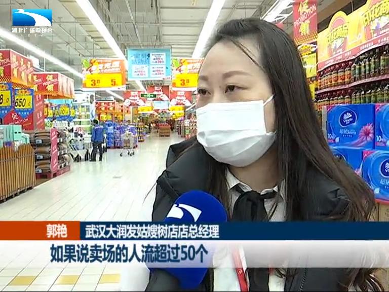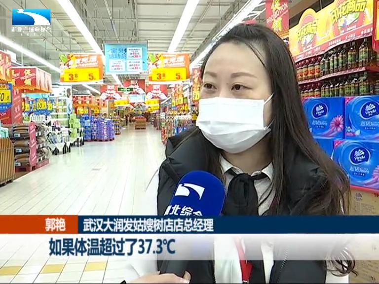 武汉大润发姑嫂树店店总经理 郭艳:如果体温超过了37.3℃,测温仪是会自动报警的。我们就有其他的应急预案,联系我们的社区。门口我们的地垫也会进行,每两小时一次的84消毒。我们的购物车、购物篮,我们是进行一天三次的消杀。