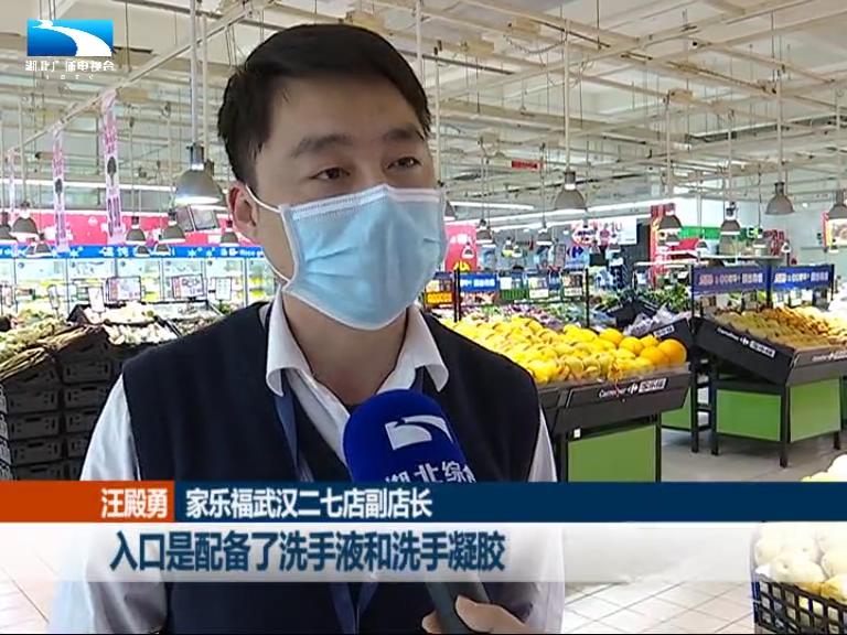 家乐福武汉二七店副店长 汪殿勇:入口是配备了洗手液和洗手凝胶,针对店内我们所有的公共区域是,每天按三个时段来定时消毒。直接接触顾客的一些购物篮、购物车,包括我们手扶梯的话,是每两个小时消毒一次。