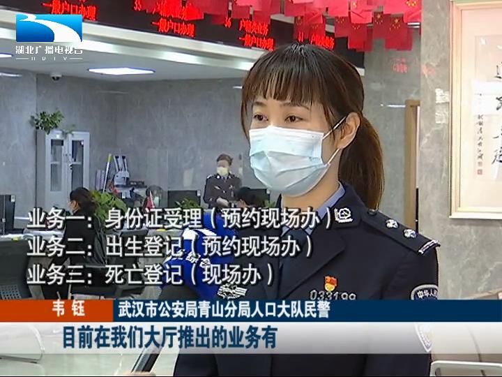 武汉市公安局青山区分局人口大队民警 韦钰:目前在我们大厅推出的业务有身份证受理、出生登记、死亡登记、户口迁入以及户口迁出,我们推荐大家在网上办理的有大学生落户的业务,这个可以全程在网上办理。