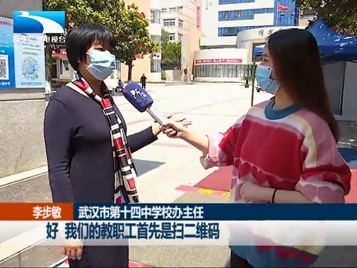 武汉市第十四中学 校办主任 李步敏:我们的教职工首先是扫二维码,我们的学生没有必要了。是按照这个地标的警戒线,保持一米的距离依次地进入校园。然后经过三块消毒地垫,进入到测温门室。体温正常的话会顺着地标垫,依次进入到自己各自的教室。体温异常的话,我们会有专门的体温复检通道,然后再采取相应措施。