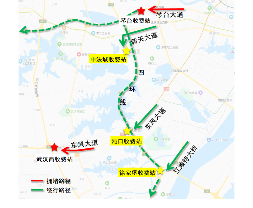 ◆如遇拥堵,需经武汉西收费站、汉蔡高速出城方向车辆可考虑行经新天大道的中法城收费站、徐家堡收费站、东风大道的沌口收费站绕行四环线。